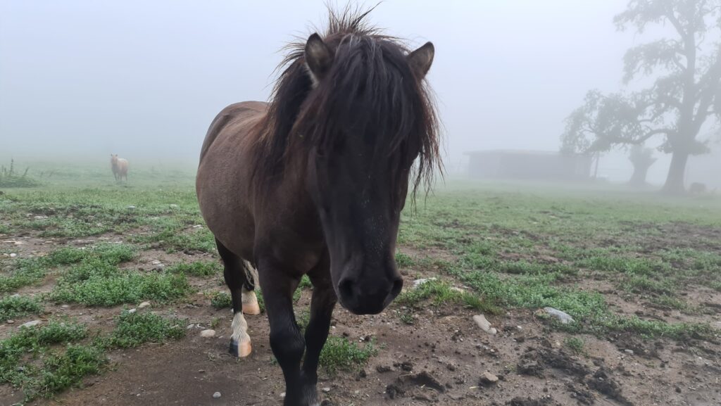 An diesem morgen hatte es auf der Weide sehr viel Nebel, und während die anderen Pferde nicht sichtbar, weit hinten auf der Weide stehen, kommen Gismo (vorne) und Soryso (hinten links) bereits zum Tor um in den Stall zu schlendern.