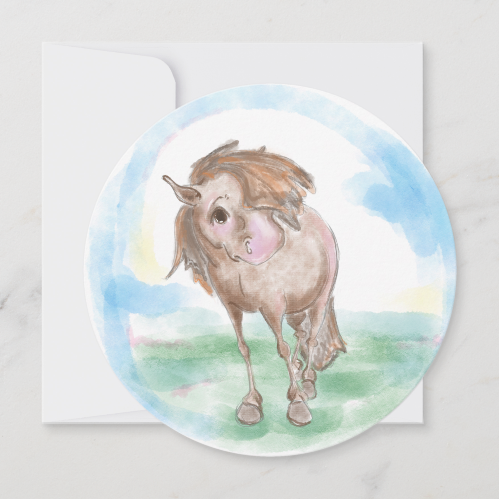 Diese besondere Karte in runder Form wird mit einem passenden Couvert geliefert und ist für alle Pferdefans und Ponyliebhaber! Das Aquarellmotiv eignet sich perfekt, um herzliche Worte an jemanden zu richten, der selbst von Pferden und Ponys begeistert ist.