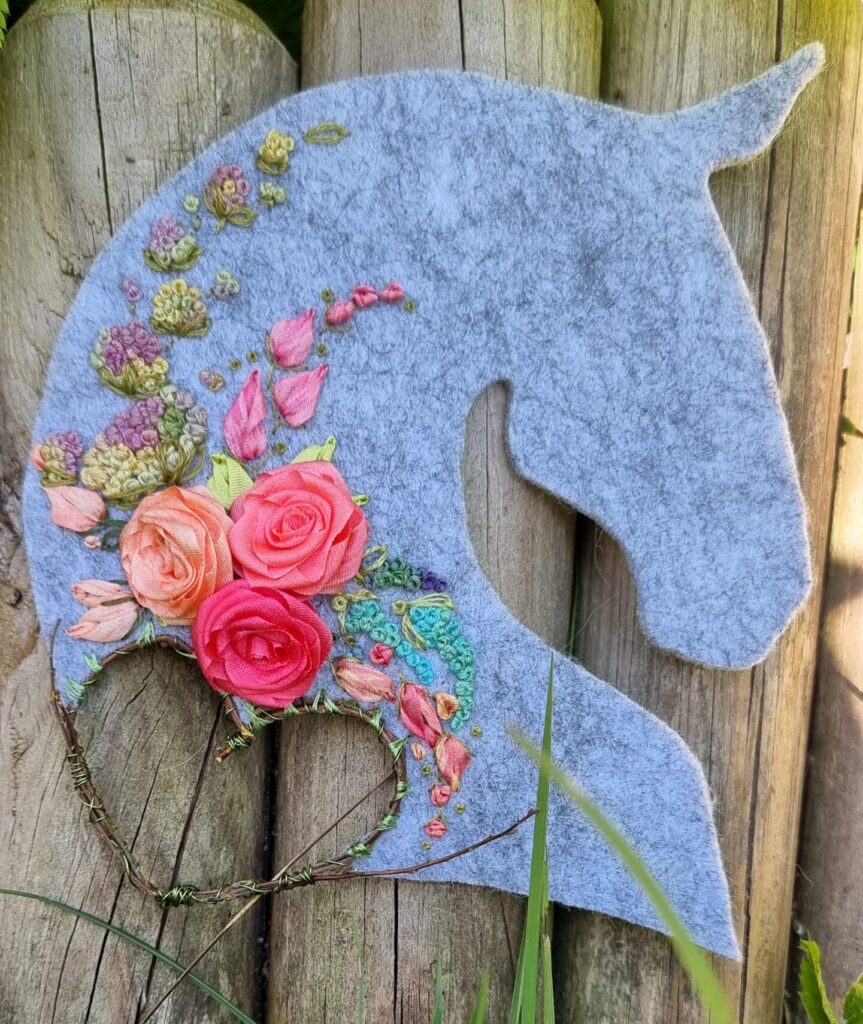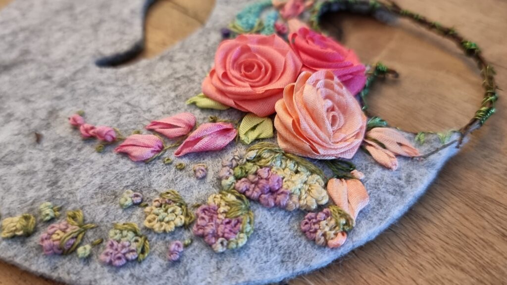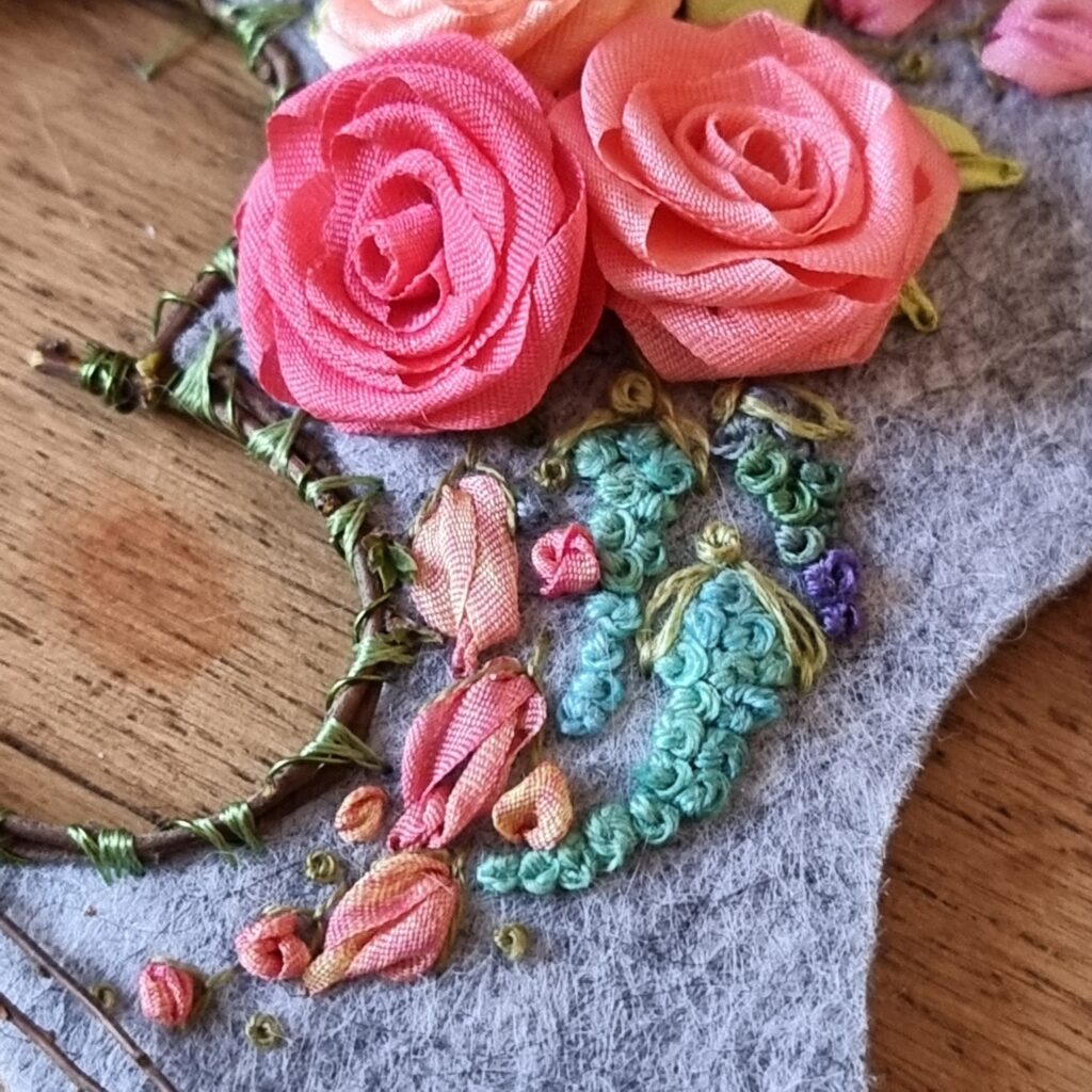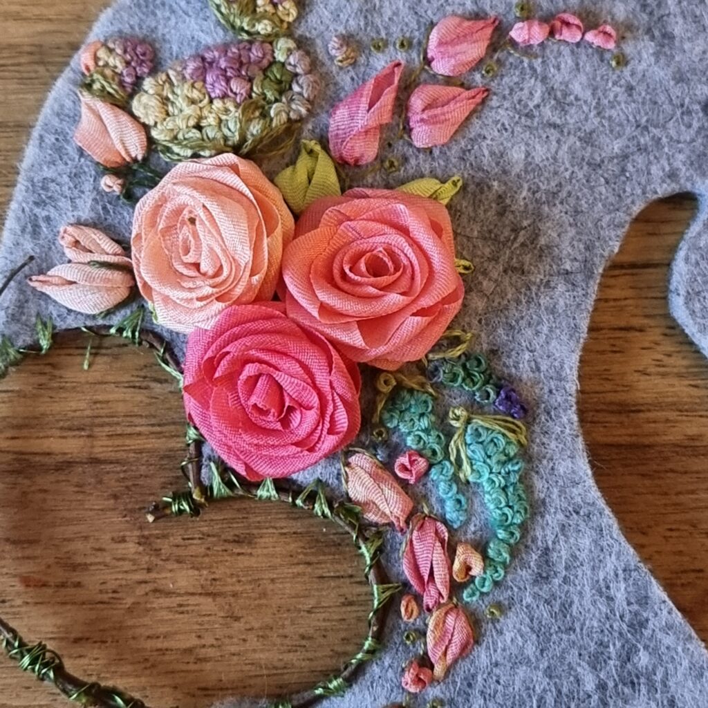 Diese frühlingshafte Stickerei vereint feine Seidenbänder, handgefärbte Garne und liebevoll gesammelte Naturmaterialien zu einem besonderen DIY-Projekt mit Herz. In dieser kleinen Bilderserie zeige ich euch Schritt für Schritt, wie ich die einzelnen Blüten auf der Filzsilhouette angeordnet und verarbeitet habe – von den handgedrehten Seidenrosen bis hin zum selbstgebundenen Zweigherz.