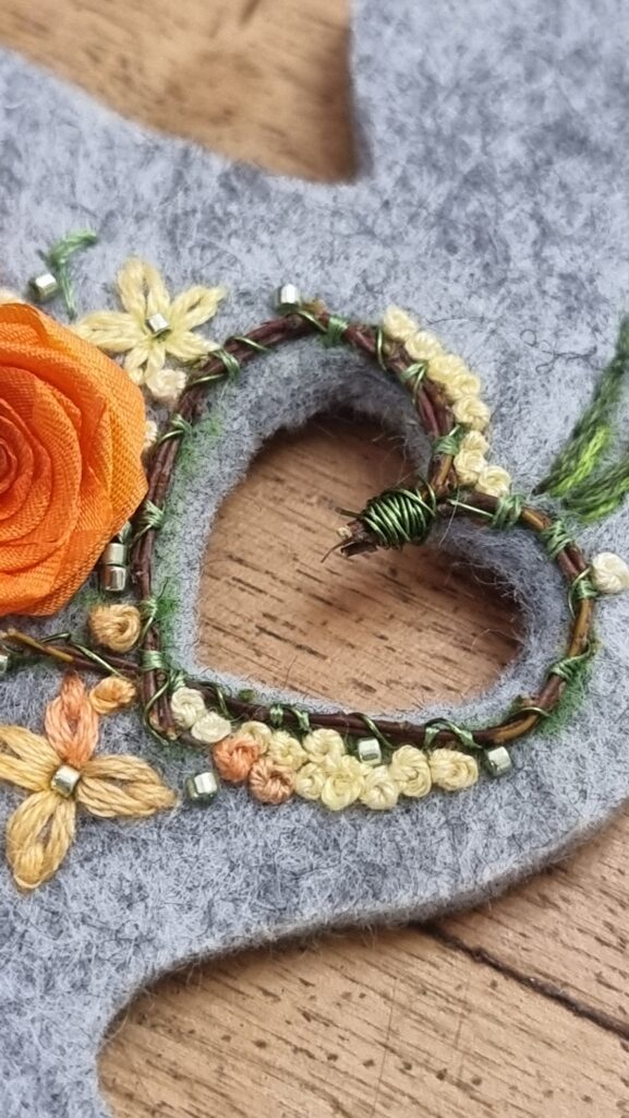 Die Stickerei selbst wird von Hand gefertigt – mit Seidenbändern, Seidengarnen und Baumwollgarnen, die aufeinander abgestimmt werden. Jede Karte ist ein Einzelstück, das durch die Materialwahl und die sorgfältige Technik eine ganz besondere Wirkung erzielt.