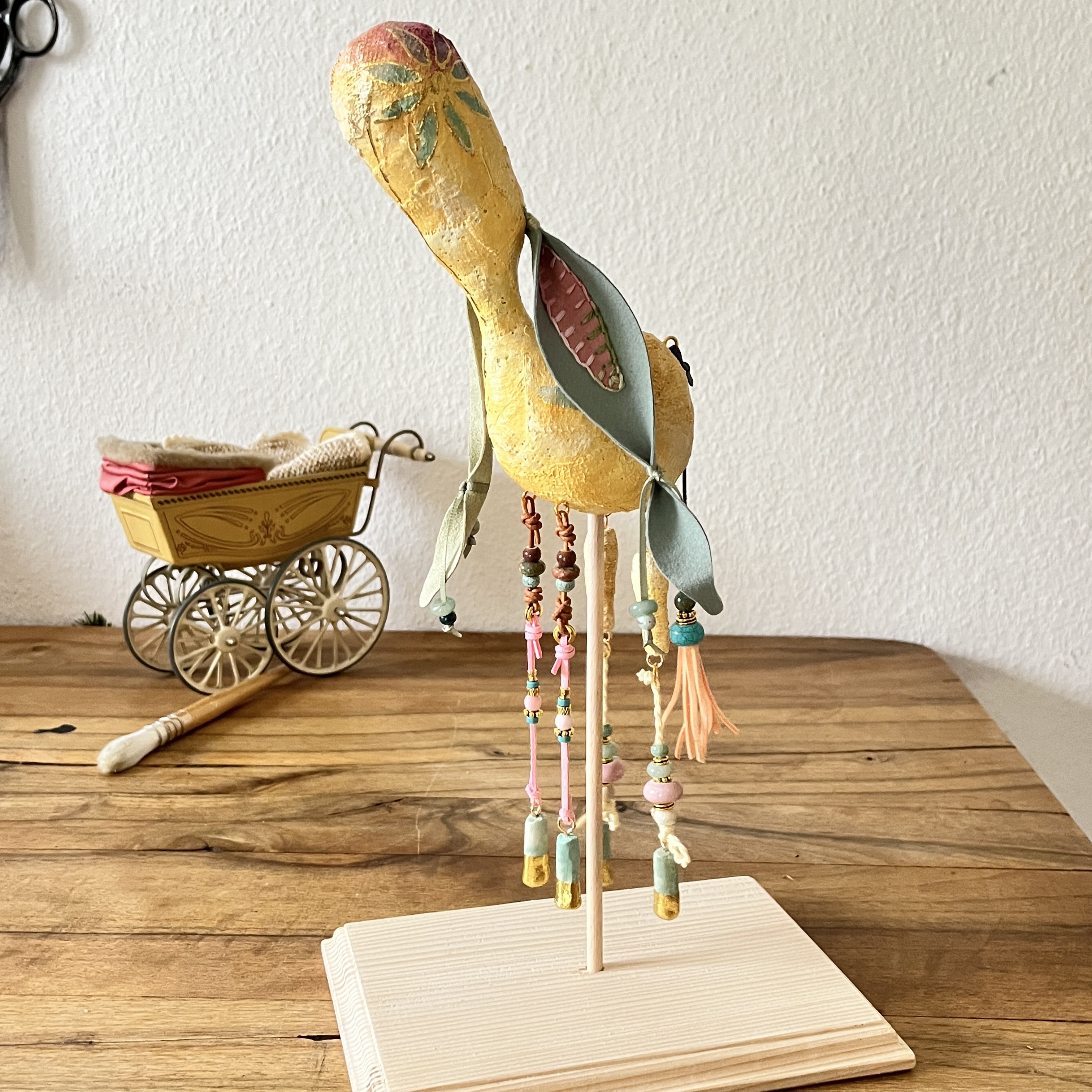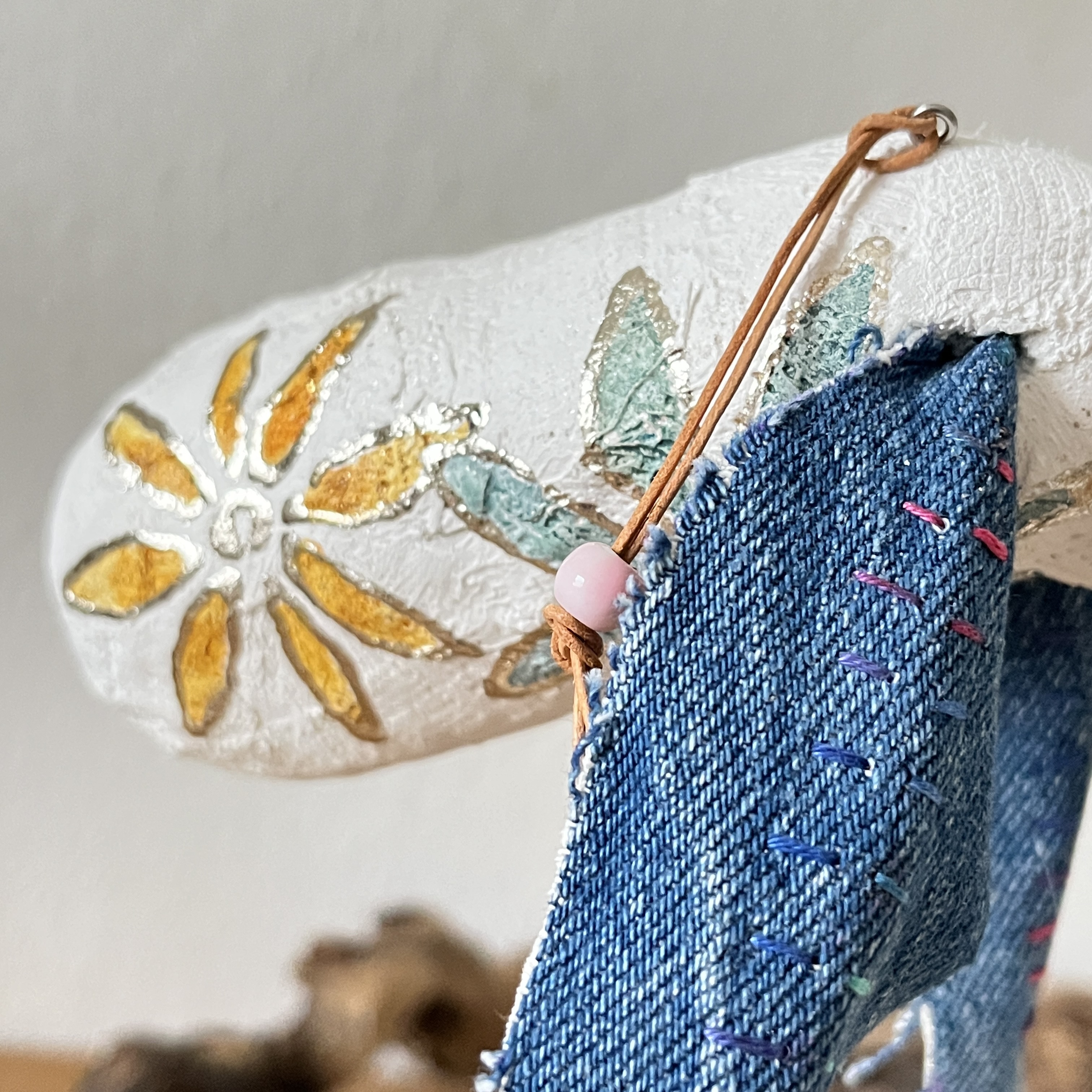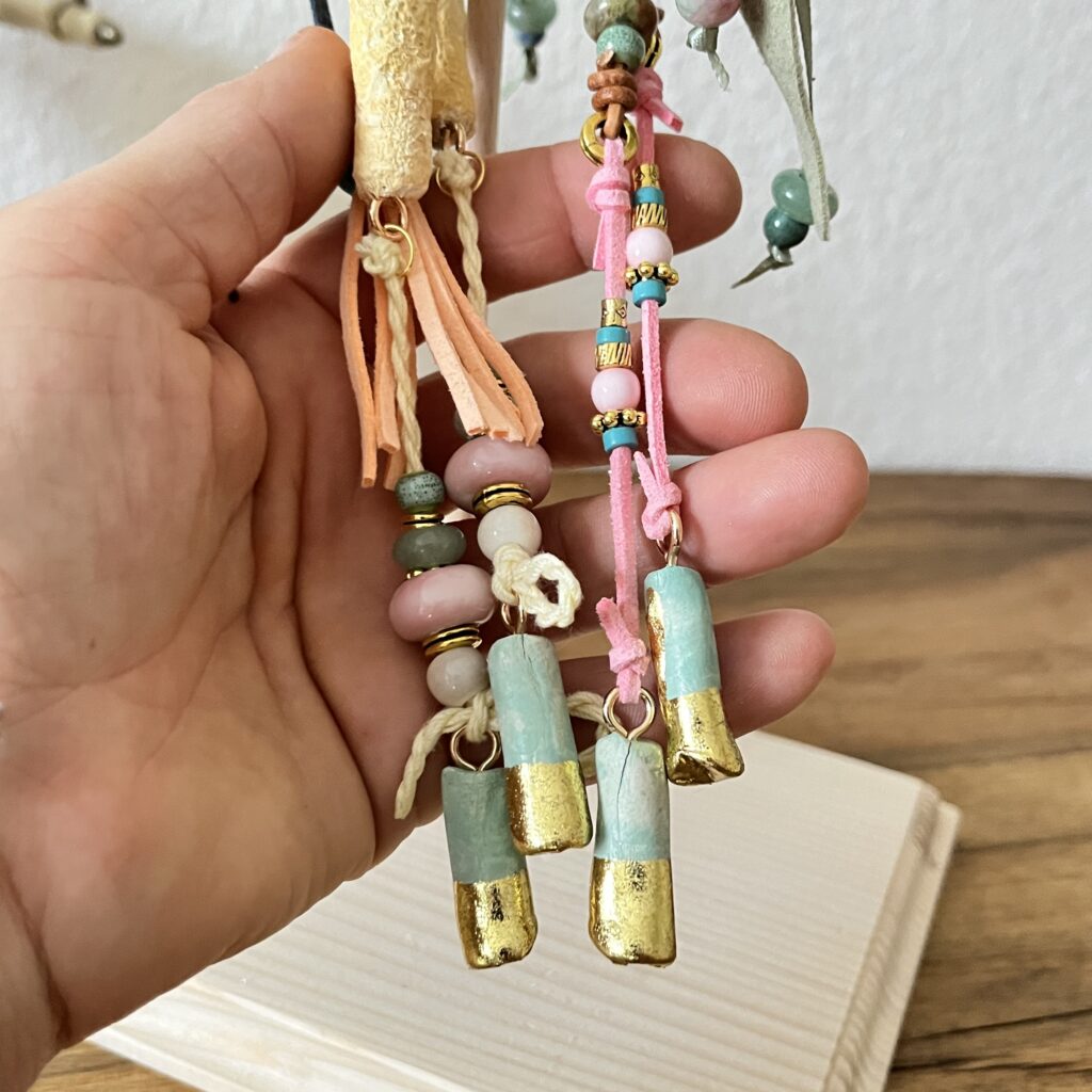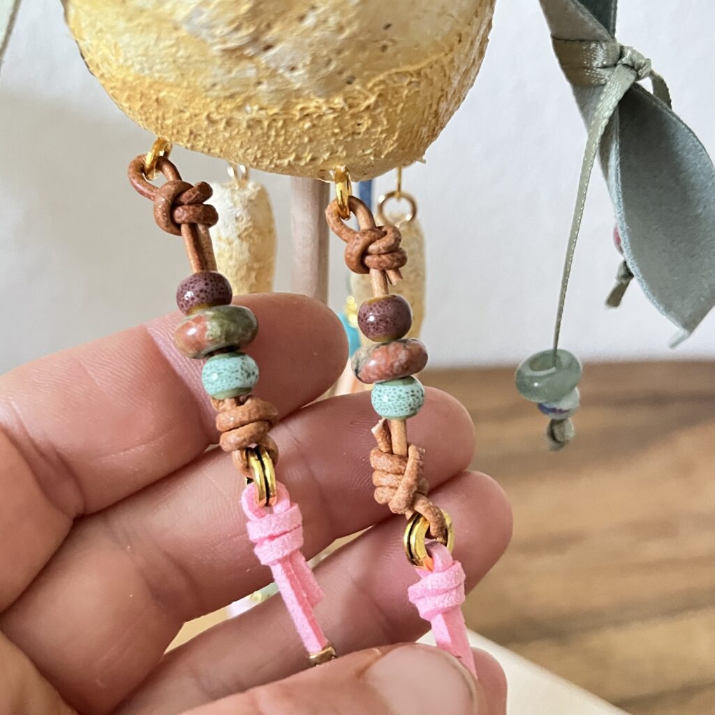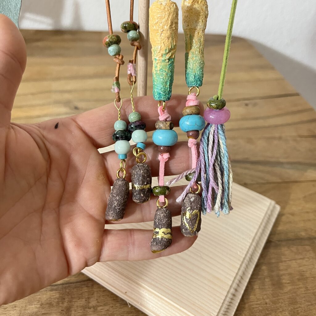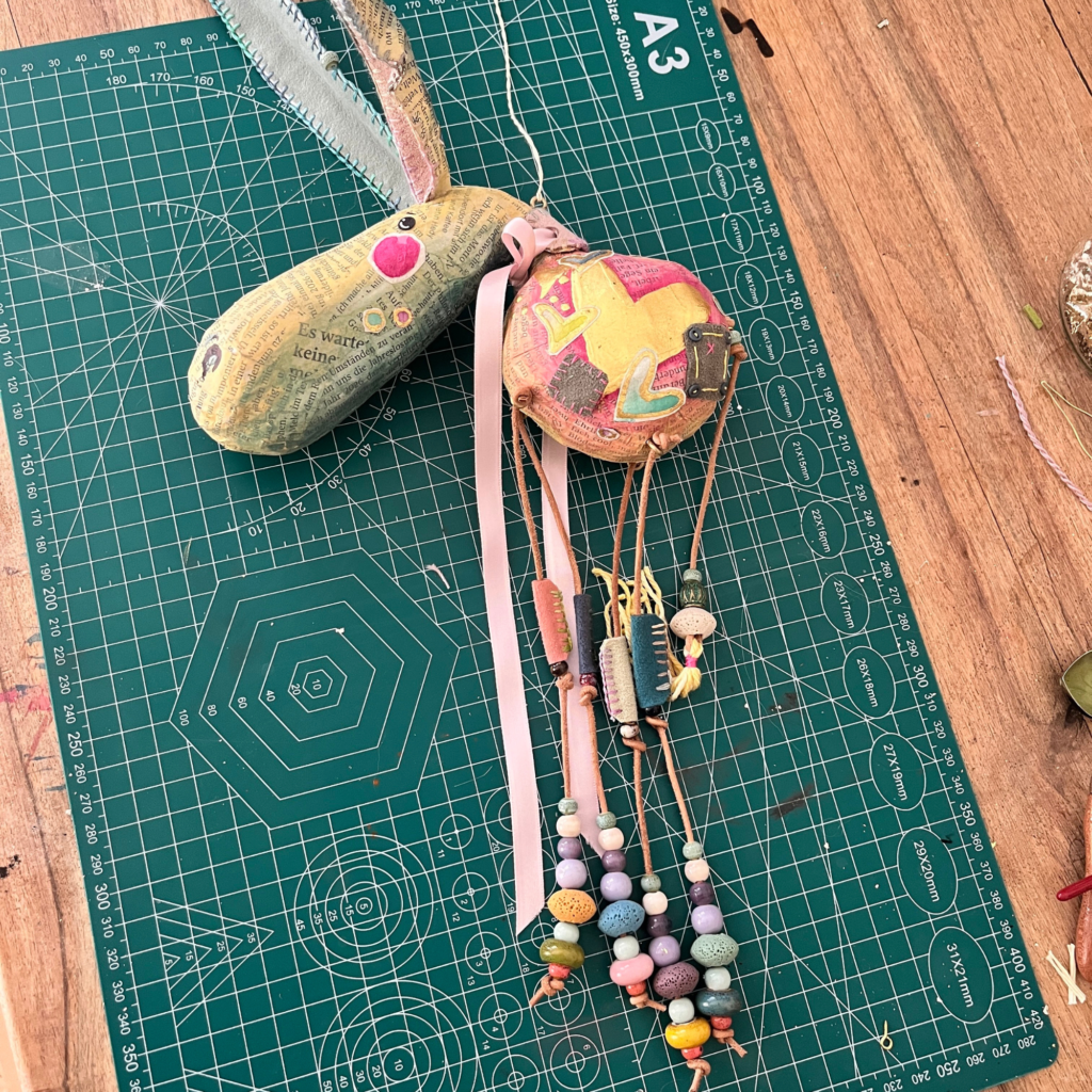 Jetzt kommen die Beine! Hier ist Platz für absolute Kreativität. Ich nutze Bänder, handgedrehte Baumwollkordeln, Lederschnüre und eine bunte Mischung aus Perlen: Keramik, Glas, Holz, Halbedelsteine oder Metall. Die oberen „Oberschenkel“ modelliere ich oft aus lufttrocknender Modelliermasse vor und überziehe sie ebenfalls mit Gips. In der Galerie unten finden Sie Inspirationen für verschiedene Varianten.