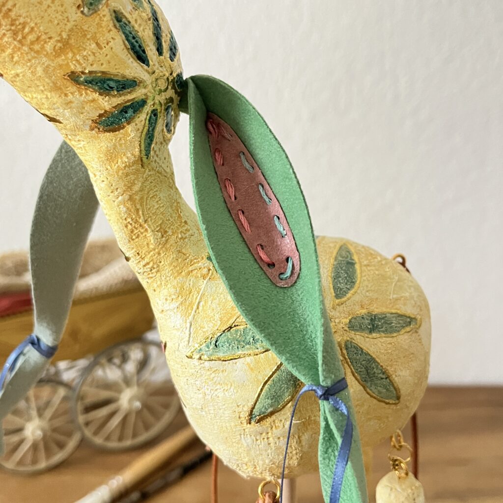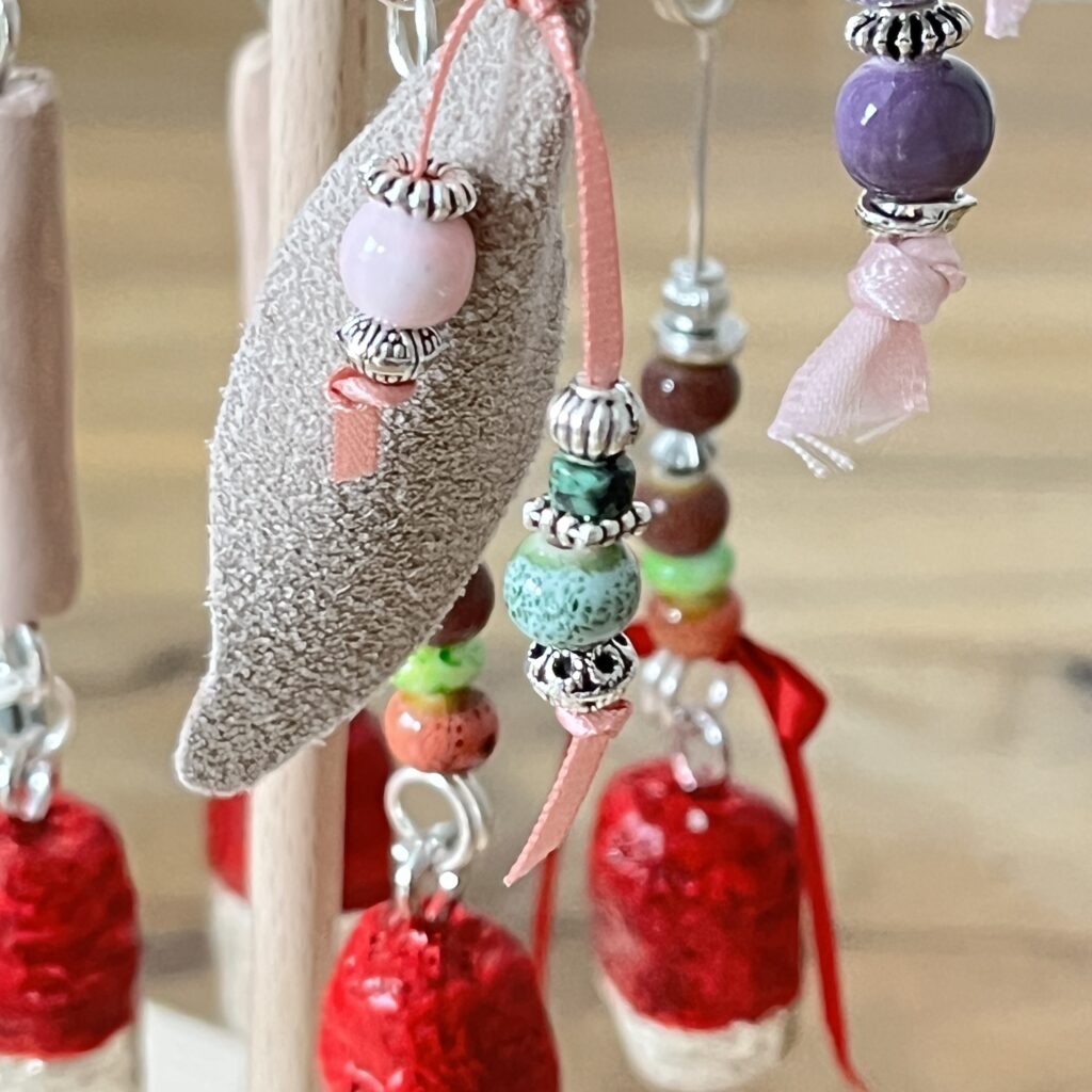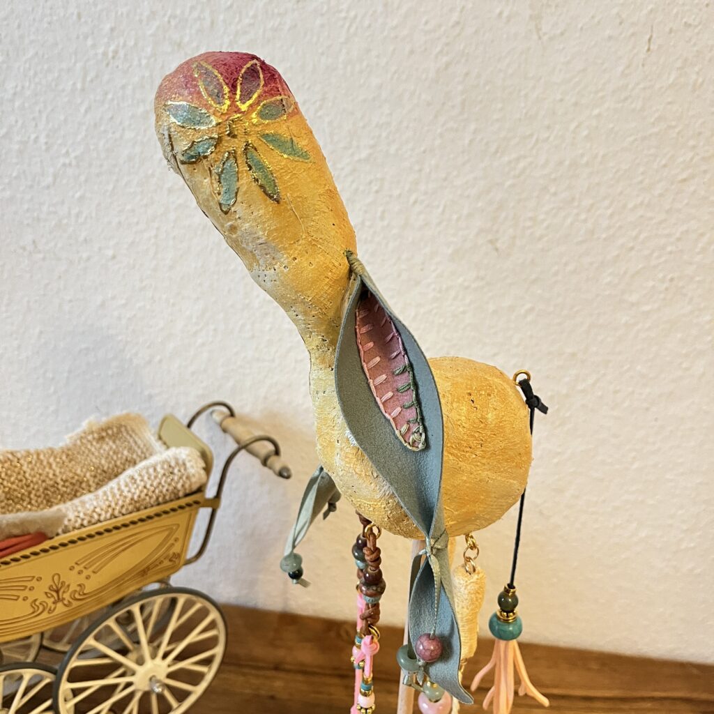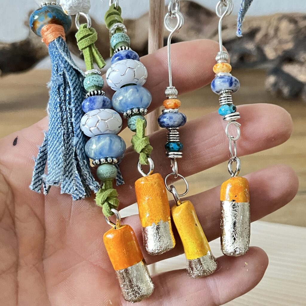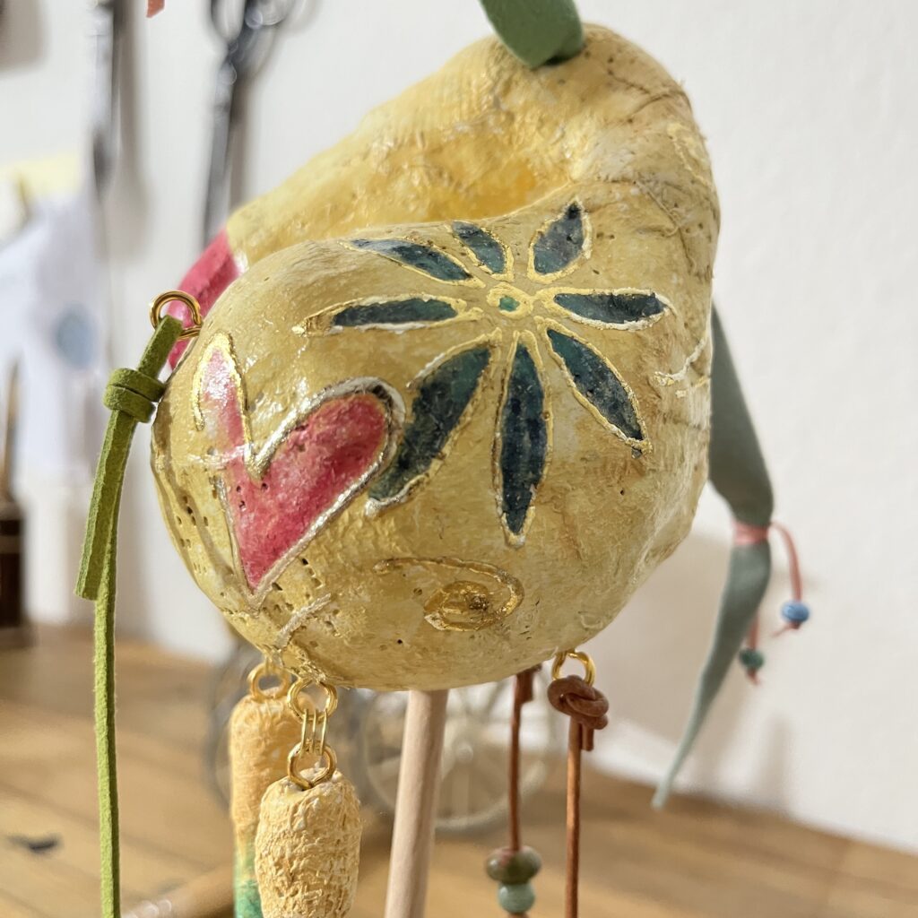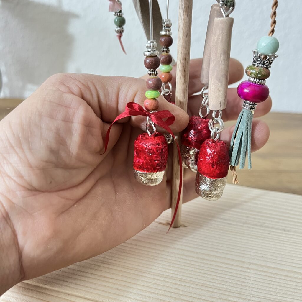 Jetzt kommen die Beine! Hier ist Platz für absolute Kreativität. Ich nutze Bänder, handgedrehte Baumwollkordeln, Lederschnüre und eine bunte Mischung aus Perlen: Keramik, Glas, Holz, Halbedelsteine oder Metall. Die oberen „Oberschenkel“ modelliere ich oft aus lufttrocknender Modelliermasse vor und überziehe sie ebenfalls mit Gips. In der Galerie unten finden Sie Inspirationen für verschiedene Varianten.