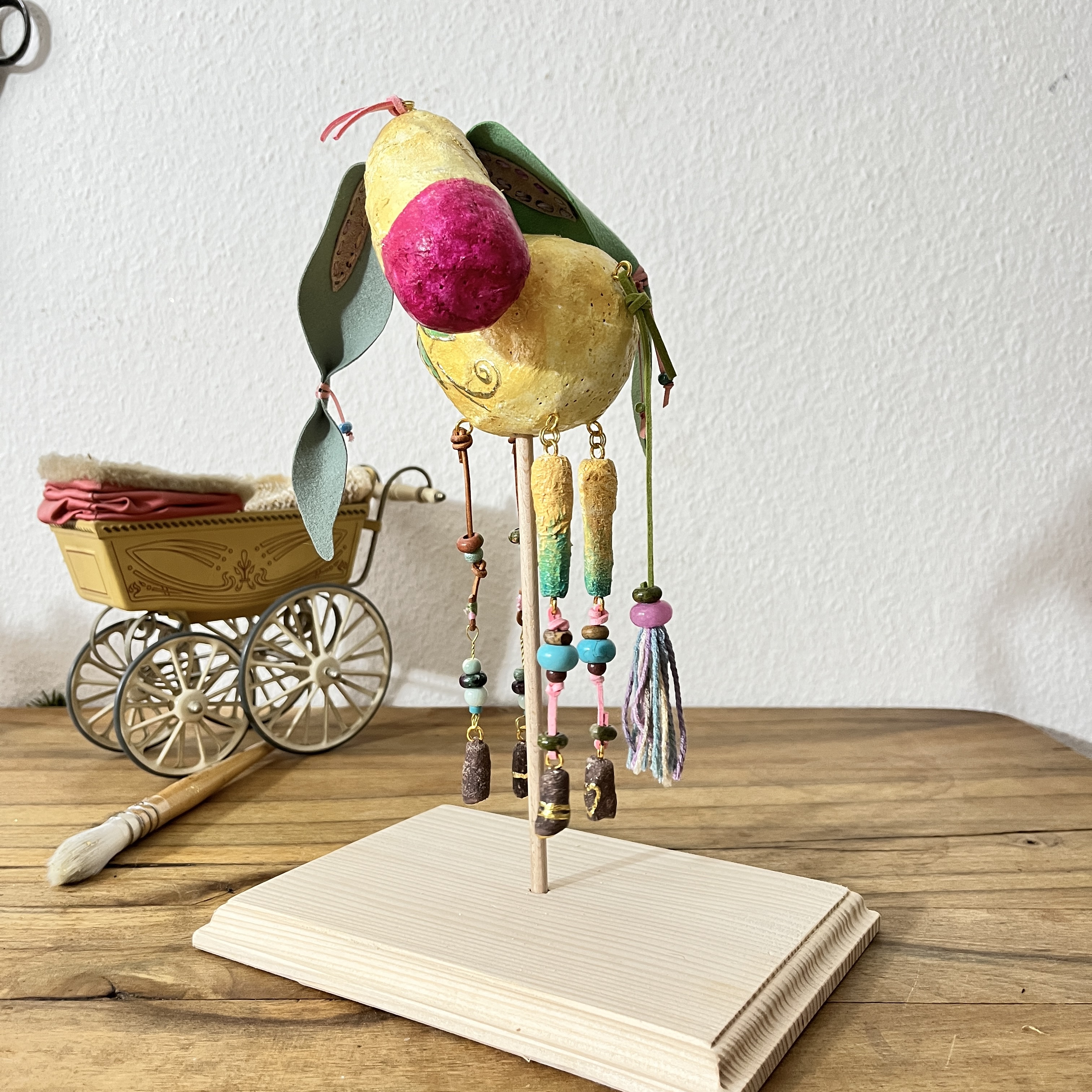 Meine Standard-Skulpturen stehen auf einer 6 mm dicken Rundholzstange (ca. 30 cm Länge). Das Holzplateau hat meist die Maße 20 x 14 x 2 cm. Natürlich können Sie hier jedes Holz oder Material wählen, das Ihnen gefällt.