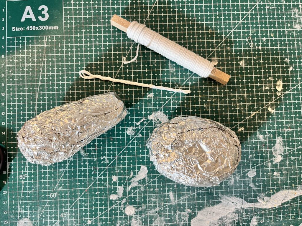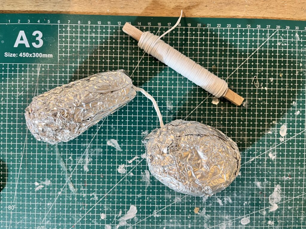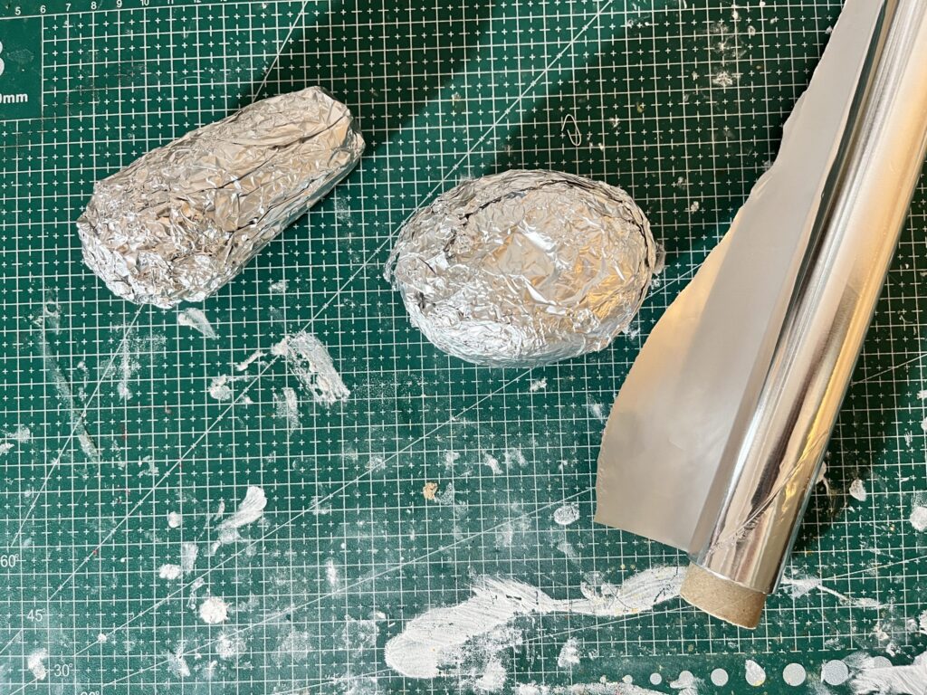Den Körper und den Kopf forme ich zuerst ganz einfach aus gewöhnlicher Haushalts-Aluminiumfolie. So bringe ich die einzelnen Teile grob in die gewünschte Größe und Form. Wichtig dabei: Den Kopf drücke ich eher locker zusammen, während ich den Körper sehr stabil und fest komprimiere. Der Körper benötigt im Verhältnis deutlich mehr Material, da er später stabil auf einem Holzständer stecken oder an einer Gewindeschraube hängen muss, ohne dass das Material ausreißt.