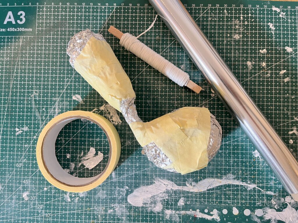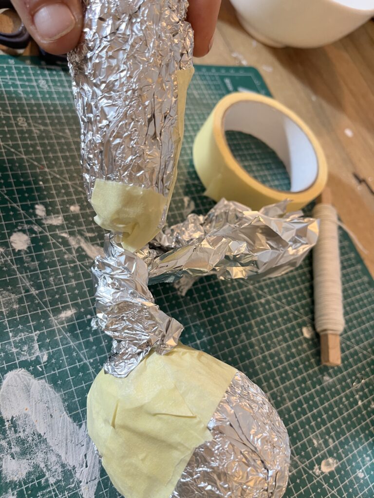 Ein reiner Drahthals sähe oft zu dünn und instabil aus. Deshalb polstere ich ihn mit zerknitterten Alufolien-Streifen auf, die ich fest um den Draht wickle. Zur Fixierung der Grundform nutze ich Malerklebeband. Mein Tipp: Gestalten Sie den Hals Schicht für Schicht. Er muss nicht im ersten Anlauf perfekt sein – durch das schrittweise Aufmessen und Festdrücken entsteht am Ende die perfekte Form.