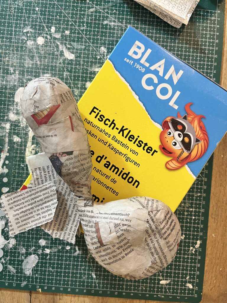 Ich verwende klassischen Kleister und in Stücke gerissene Zeitung. Kleiner Tipp: Bei Figuren, die eine reine Pappmaché-Oberfläche behalten, achte ich darauf, welche Schlagworte auf der Zeitung stehen. Für die Unterschichten, die später unter Gips verschwinden, nutze ich alles, was mir in die Hände kommt. Ich mische den Kleister meist etwas dicker an als auf der Packung angegeben – so lässt sich das Papier wunderbar „anschmieren“.
