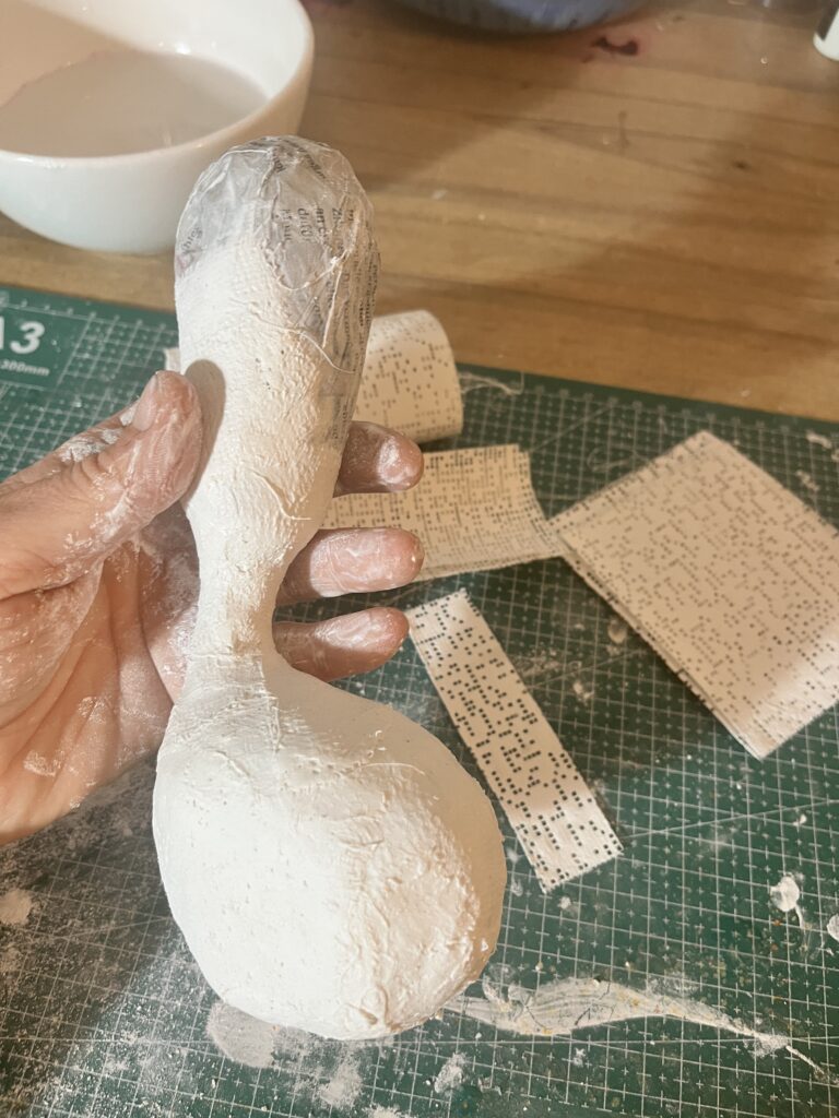 Sobald das Pappmaché vollständig getrocknet ist, folgen die Gipsbinden. Ich schneide mir verschiedene Stücke zurecht und bedecke damit den gesamten Körper. Da sich das Material im nassen Zustand toll dehnen lässt, entstehen weiche Linien und eine wunderschöne, lebendige Textur.
