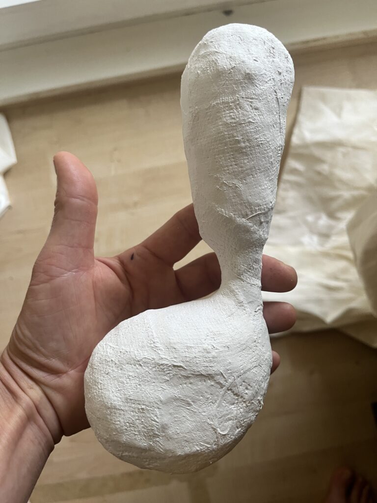 Hier sieht man die fertig überzogene Skulptur. Die Oberfläche der Gipsbinden wirkt lebendig und ist dennoch fein genug für die spätere Bemalung.