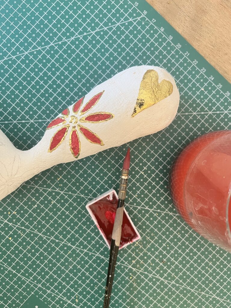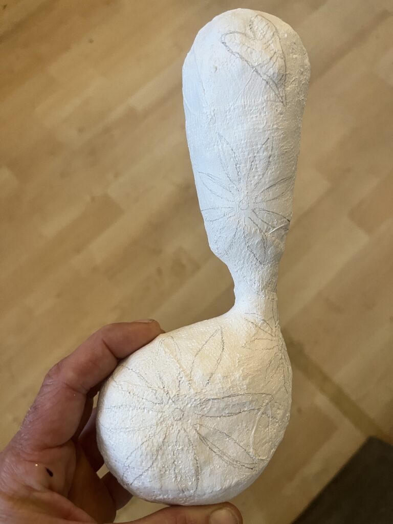 In diesem Stadium entscheide ich: Bleibt die Skulptur puristisch weiß oder wird sie bunt? Mit einem Bleistift skizziere ich Blumen oder ein Herz direkt auf den Gips. Falls eine Linie misslingt: Einfach den Gips mit einem feuchten Finger kurz anlösen, glattstreichen und nach dem Trocknen neu skizzieren. Ein Radiergummi funktioniert auf Gips nämlich nicht besonders gut.