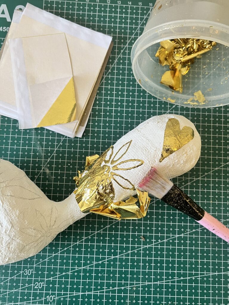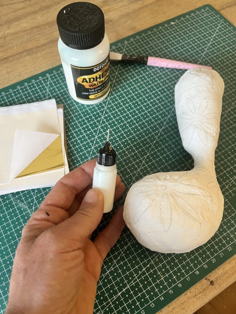 Oft starte ich mit der Gold-Veredelung noch vor der Farbe. Mit einer feinen Applikatorflasche trage ich die Anlegemilch auf die Skizzen auf. Wichtig: Die Milch muss gut antrocknen (sie wird dann meist transparent und bleibt klebrig), bevor das Blattgold (Schlagmetall) aufgelegt wird. Da die Gipsbinde die Milch nicht so stark aufsaugt, lassen sich damit sehr feine Linien ziehen.