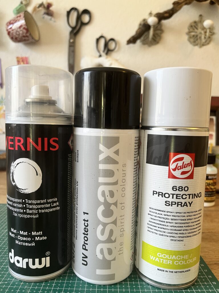 Sobald die Farben trocken sind, fixiere ich den Körper mit Lascaux UV-Protect. Je nach gewünschtem Effekt nutze ich die matte oder die glänzende Variante. Wichtig ist, den Schutz in 2–3 hauchdünnen Schichten aufzutragen.